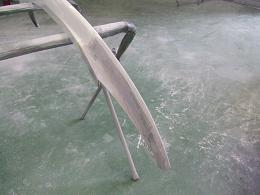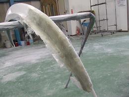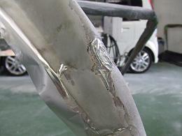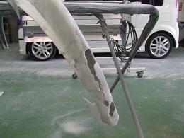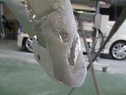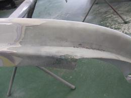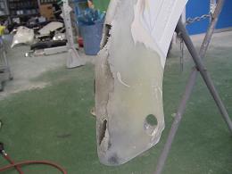 塗装をはがし、ゲルコートも削り落とします。割れてしまっているところと、ヒビもすべて削り取ります。