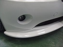 FRP製のフロントスポイラーを修理します。バンパーにかぶせるタイプで裏からファイバーを貼れないので、表から補修していきます。